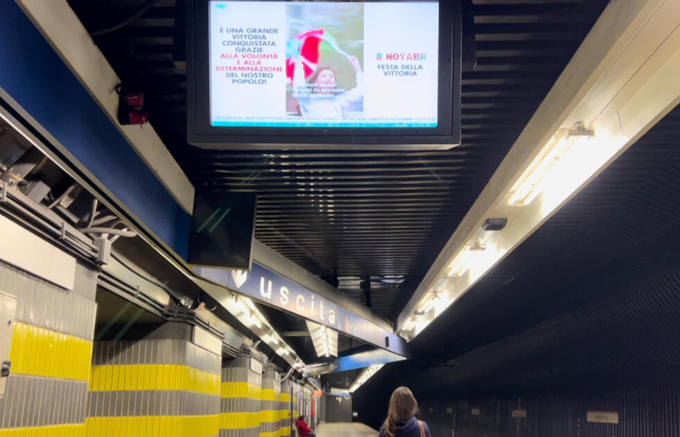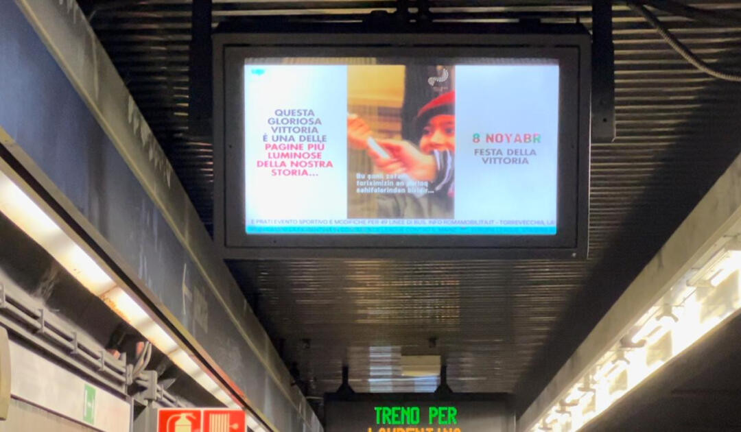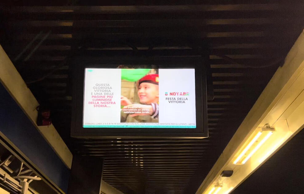 Sui monitor delle stazioni della metropolitana e alle fermate degli autobus della capitale italiana è stato proiettato un video in occasione del quinto anniversario dell’8 novembre – la Giornata della Vittoria.